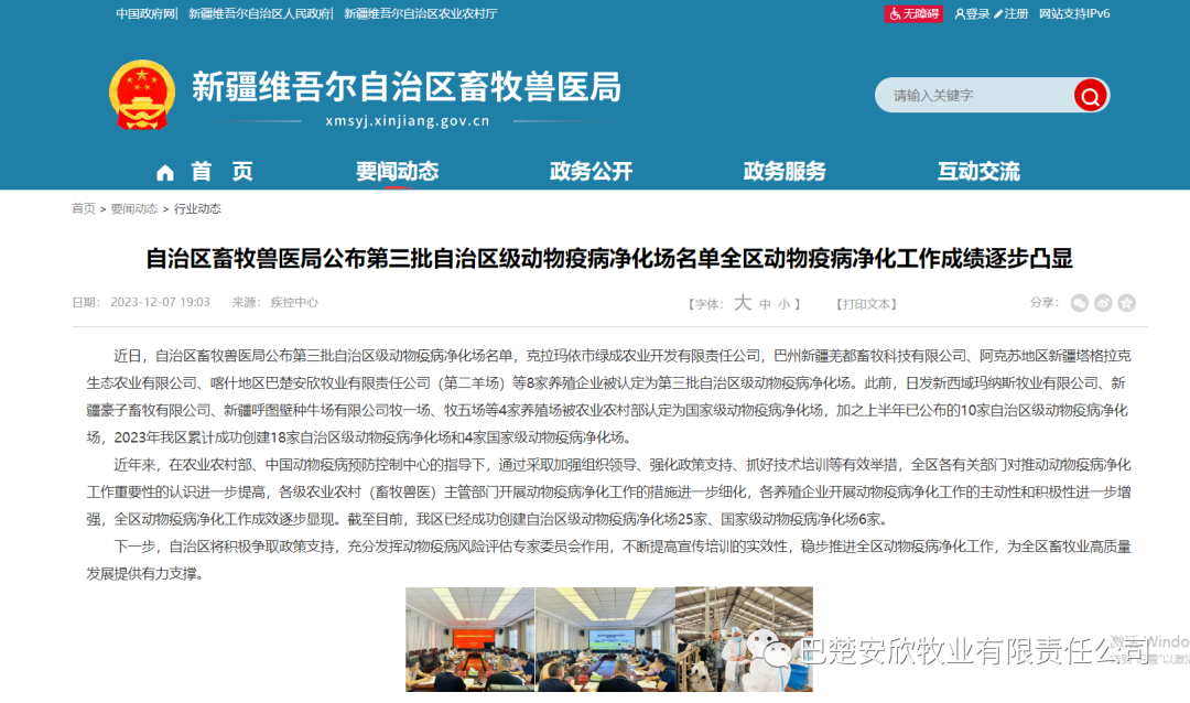 2023年12月,自治區(qū)畜牧獸醫(yī)局第三批自治區(qū)級動物疫病凈化場名單公布,巴楚公司第二羊場獲此殊榮。三年多來,在農(nóng)業(yè)農(nóng)村部、中國動物疫病預(yù)防控制中心的指導(dǎo)下,巴楚安欣通過采取加強(qiáng)組織管理、爭取政策支持、抓好技術(shù)培訓(xùn)等有效舉措,公司養(yǎng)殖場區(qū)對動物疫病凈化工作的措施進(jìn)一步細(xì)化,出色完成動物疫病凈化工作,提升全公司動物疫病防控整體水平,為全區(qū)動物疫病凈化工作積累成功經(jīng)驗(yàn)。安欣牧業(yè)必將不斷提高宣傳培訓(xùn)的實(shí)效性,穩(wěn)步推進(jìn)全區(qū)動物疫病凈化工作,為全區(qū)畜物業(yè)高質(zhì)量發(fā)展提供有力支撐。